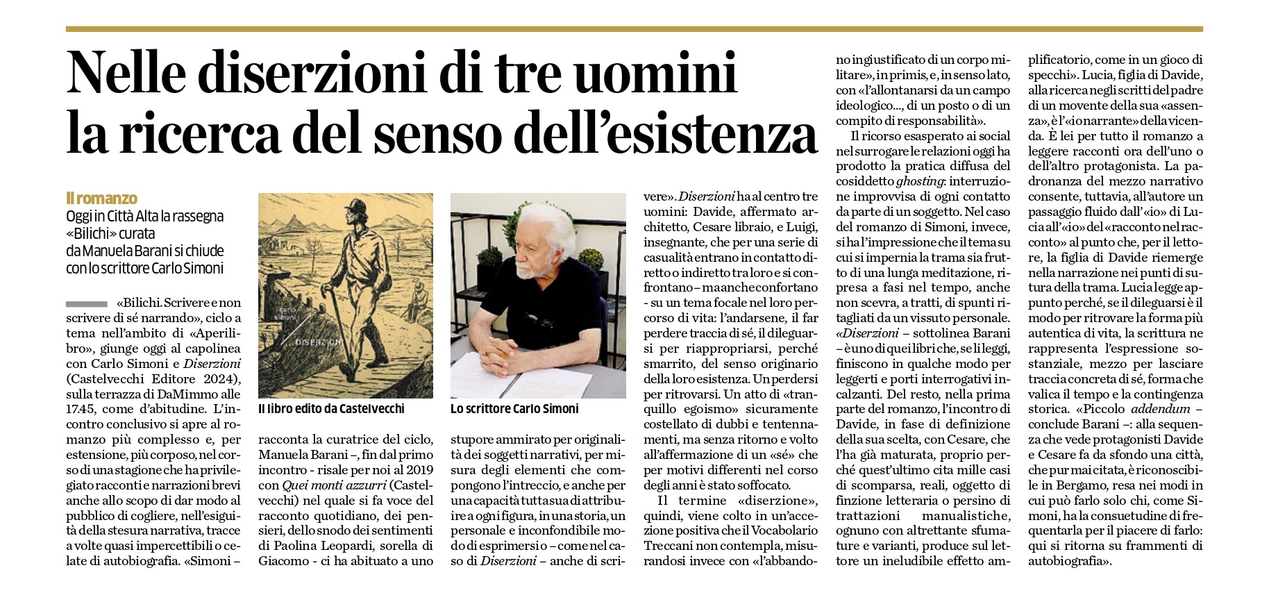 Spariscono anche i tre protagonisti dell’ultimo romanzo del bresciano Carlo Simoni, ma poiché questo triplice dileguamento avviene in tempi a noi contemporanei — che sono quelli dell’obbligo di presenza, del mantra della visibilità, della perenne esposizione in società e nei social — le loro sono vere e proprie «Diserzioni», e tale è il titolo del grande, fluviale, stratiforme e polisemico romanzo (Castelvecchi editore, pp. 362, euro 27, presentazione venerdì 22 novembre alle 18 alla Libreria Nuova Rinascita in via della Posta 7 a Brescia) che segna il nuovo approdo della scrittura romanzesca di Simoni.